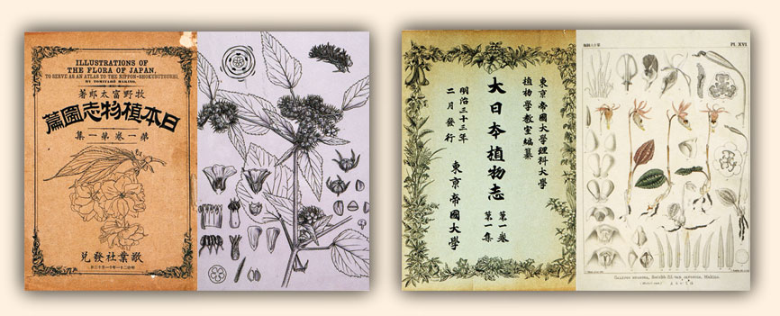 【左】明治21年刊行「日本植物志図篇」・・・富太郎が図を描き、石版印刷した自費出版。 【右】明治33年刊行「大日本植物志」・・・完璧な記載と精密植物画は世界的な評価を受けた。 |